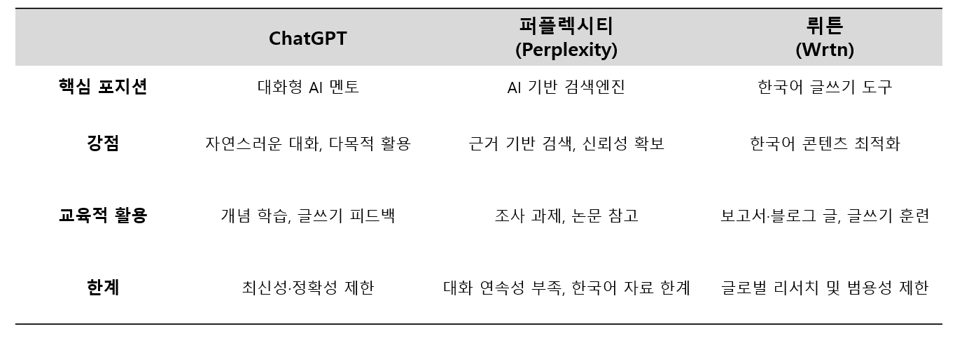결국 학습자에게 중요한 것은 단일 AI를 고집하기보다 목적에 따라 병행 활용하는 전략입니다. 예를 들어, ChatGPT로 기본 개념을 이해하고 → 퍼플렉시티로 근거와 출처를 확보한 뒤 → 뤼튼으로 최종 보고서를 정리하는 방식은 학습 효율성과 결과물의 완성도를 동시에 높일 수 있습니다.